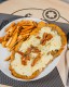 Escalope empanado gratinado con mozzarella, cebolla y queso parmesano.